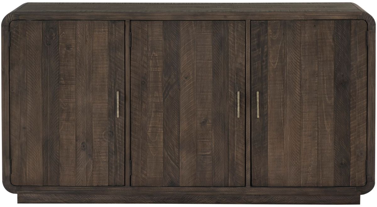 With three magnetic catch doors revealing six sleek storage sections + adjustable interior shelving, this storage buffet is a rustic knock-out retreat for all your dining essentials. A gently curved showcase with a fully finished back, this darkly warming beauty makes for an elegant design off to the side or displayed as a focal point with its confident finish.