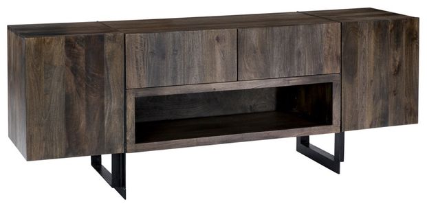 A contemporary entertainment cabinet with a transitional design for any decor. Featuring two large drawers, two doors with shelving, and an open compartment for audio-video components, this unit will keep your entertainment area neat. Crafted from solid wood and black, powder-coated iron for top-notch quality.En savoir plus