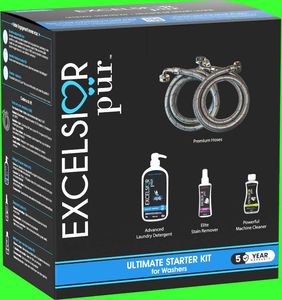 La Trousse de départ ultime Excelsior Pür fournit tout ce qu’il faut pour une performance de lessive optimale et une protection durable de la laveuse. Cet ensemble complet comprend une paire de tuyaux de laveuse en acier inoxydable de qualité supérieure, 950 ml de détergent concentré 7,5x (79 brassées), 120 ml de détachant, 250 ml de nettoyant pour laveuse, et un détecteur de fuite d’eau pour une sécurité accrue. Disponible en Parfum Frais ou Sans Parfum.En savoir plus