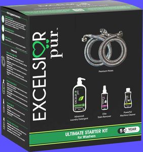 La Trousse de départ ultime Excelsior Pür fournit tout ce qu’il faut pour une performance de lessive optimale et une protection durable de la laveuse. Cet ensemble complet comprend une paire de tuyaux de laveuse en acier inoxydable de qualité supérieure, 950 ml de détergent concentré 7,5x (79 brassées), 120 ml de détachant, 250 ml de nettoyant pour laveuse, et un détecteur de fuite d’eau pour une sécurité accrue. Disponible en Parfum Frais ou Sans Parfum.En savoir plus